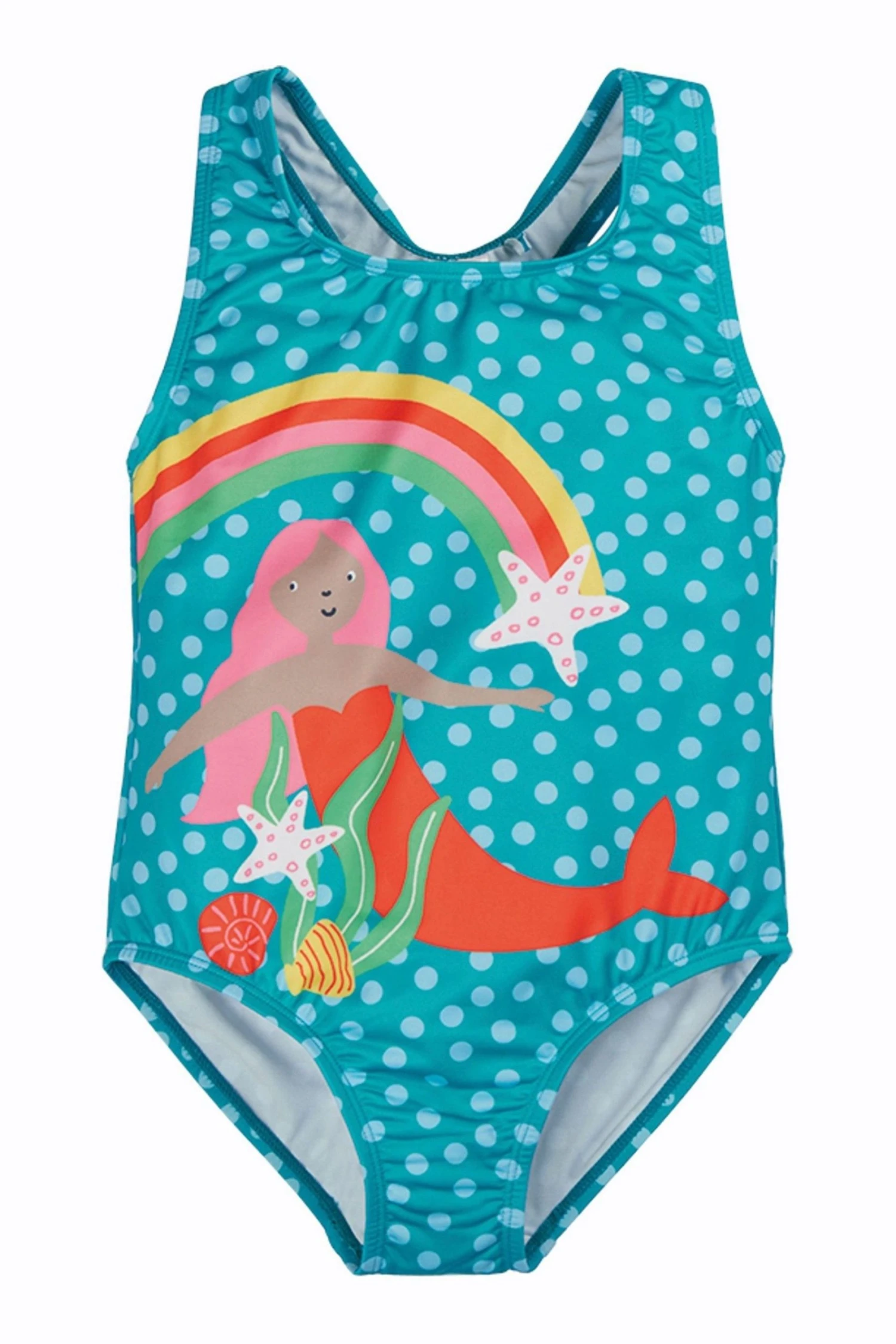 The Frugi Seaside swimsuit features a bright and beautiful rainbow and mermaid design. Made with recycled material that meets UPF 50+ standard and soft lining for extra comfort. Chlorine safe colours and prints.
