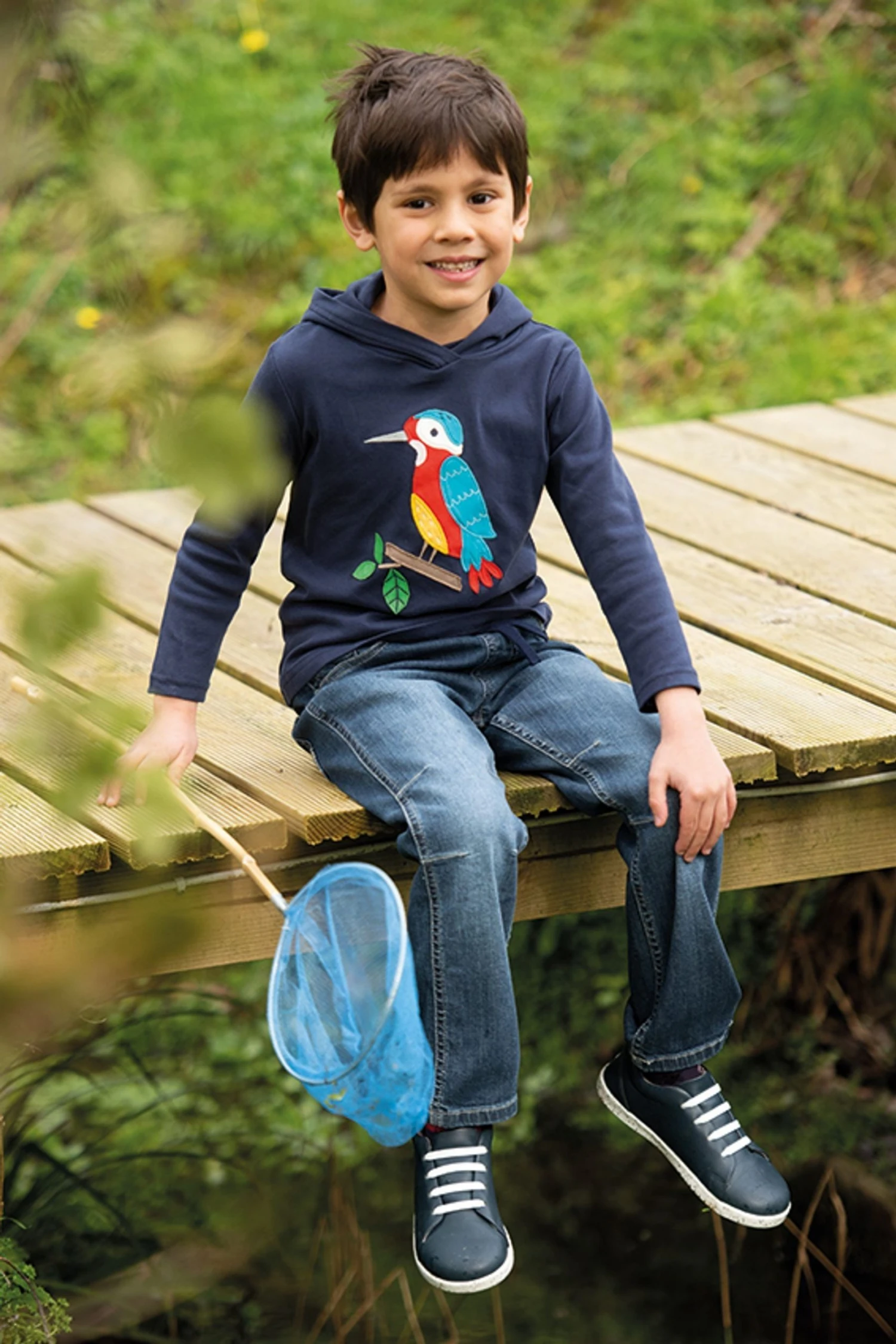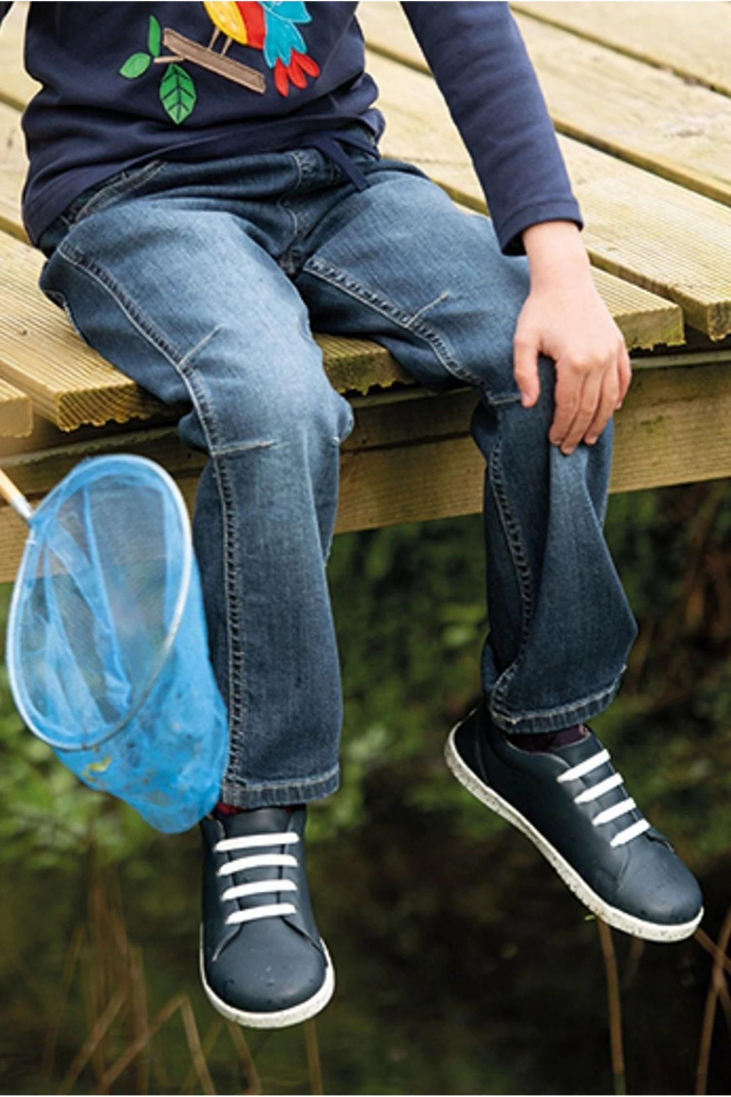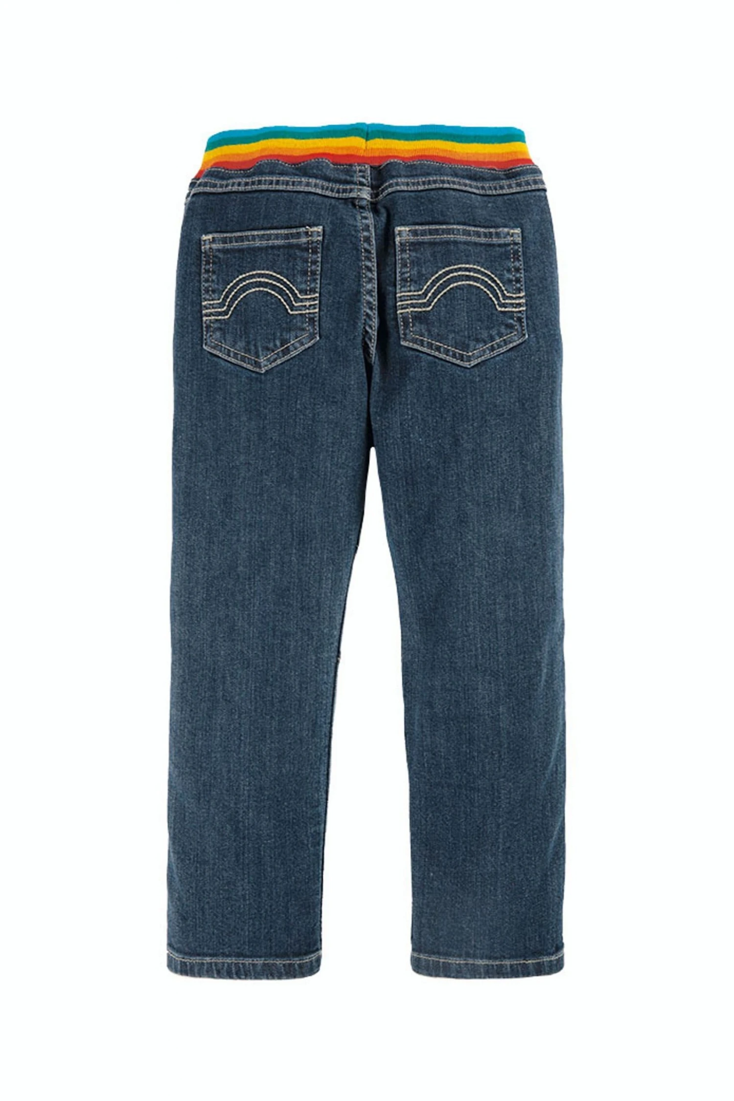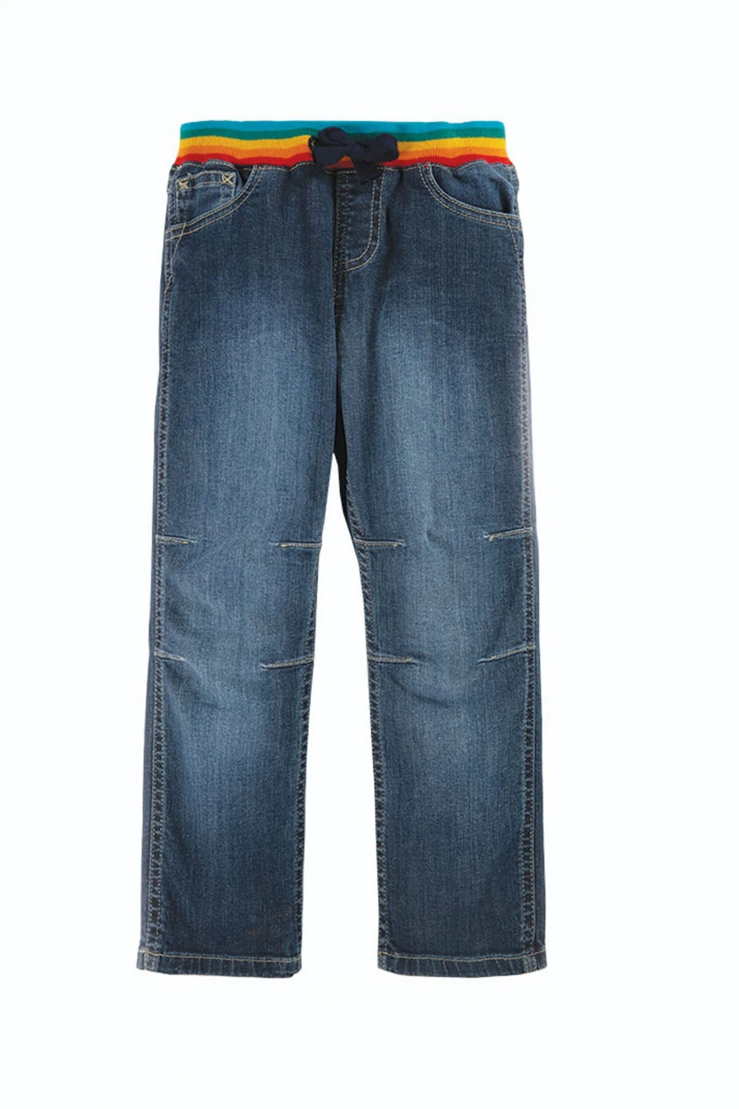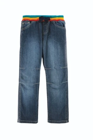 Frugi Organic soft waistband comfortable jeans you have been looking for! Slim-fit jean with striped ribbed band waist and adjustable drawcord.