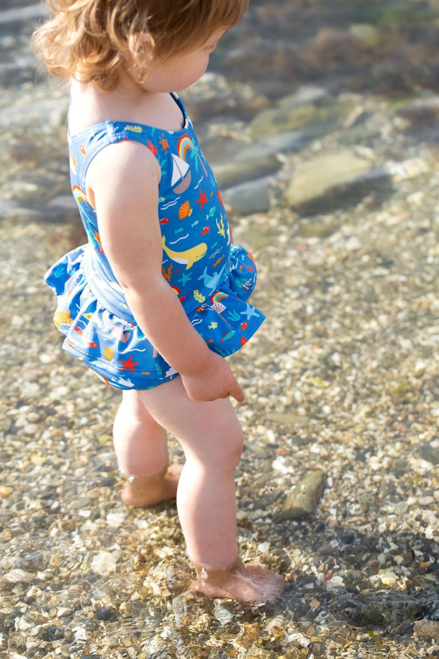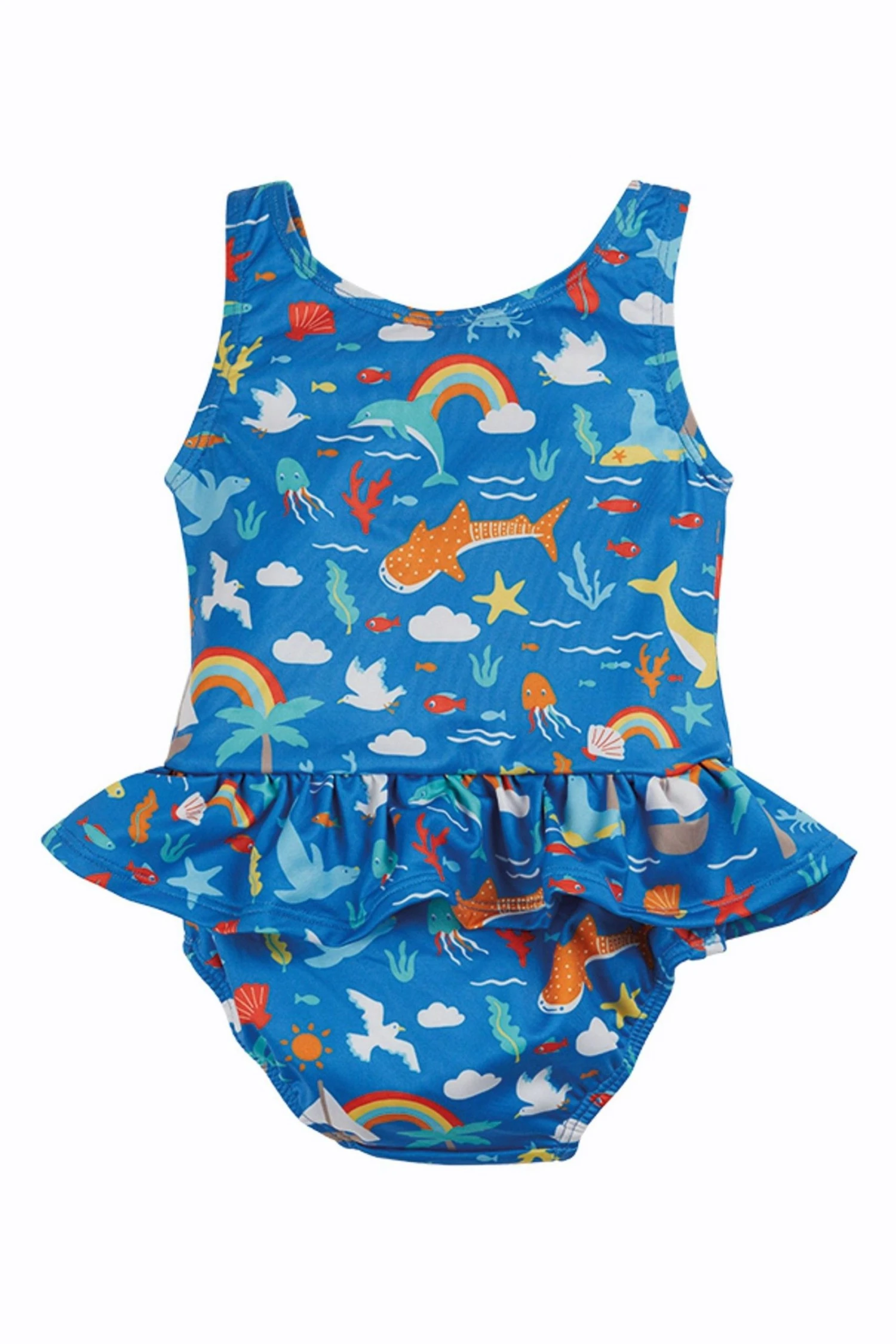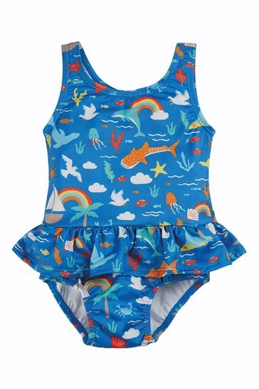 Fishing for Rainbows! This super cute Frugi swimsuit has hidden superpowers… it is made with recycled material that meets UPF 50+. Includes a soft lining for extra comfort.