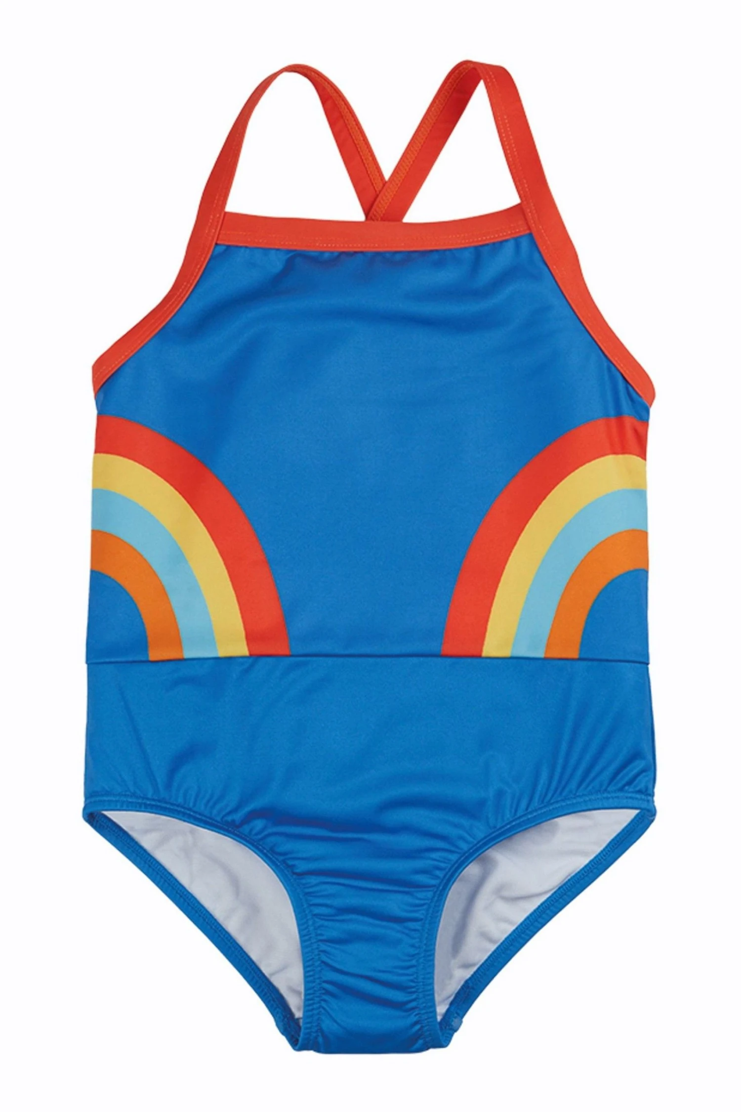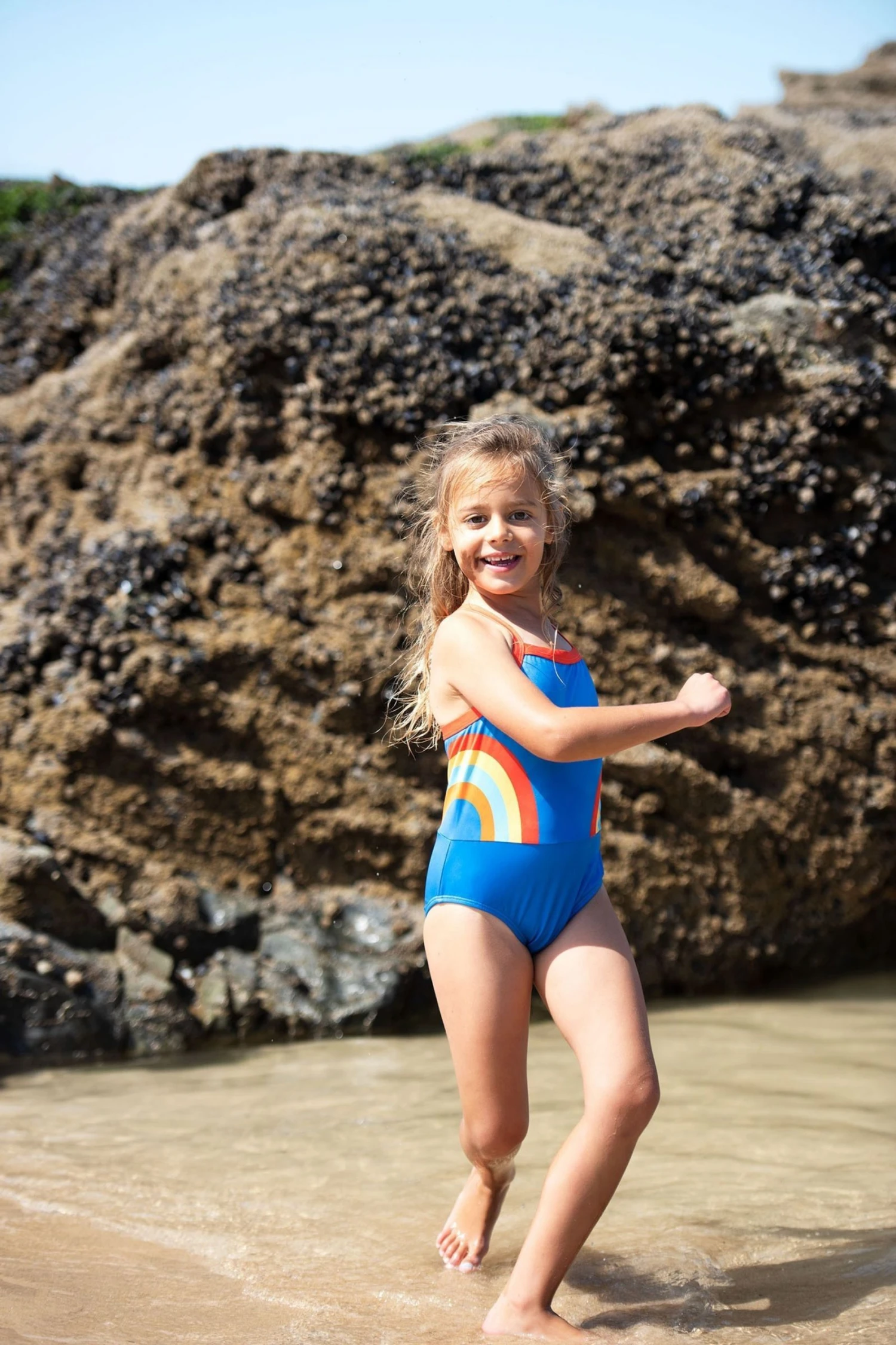 Perfect for rainbow lovers! The Thea Rainbow Swimsuit features cross back detail and includes a soft lining. Made with recycled material that meets UPF 50+ standard.