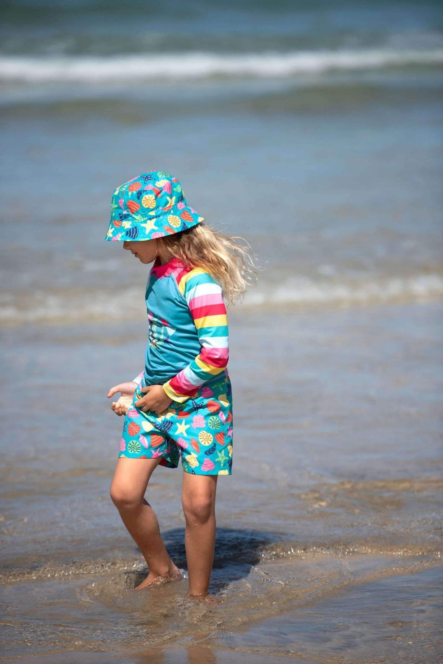 A fun seashell design with added practicality! The Frugi Board shorts are quick drying, made in chlorine safe colours and prints and have mesh lining for added comfort. Elasticated waist and drawcord. Made from recycled bottles, in material that meets UPF 50+ standard.