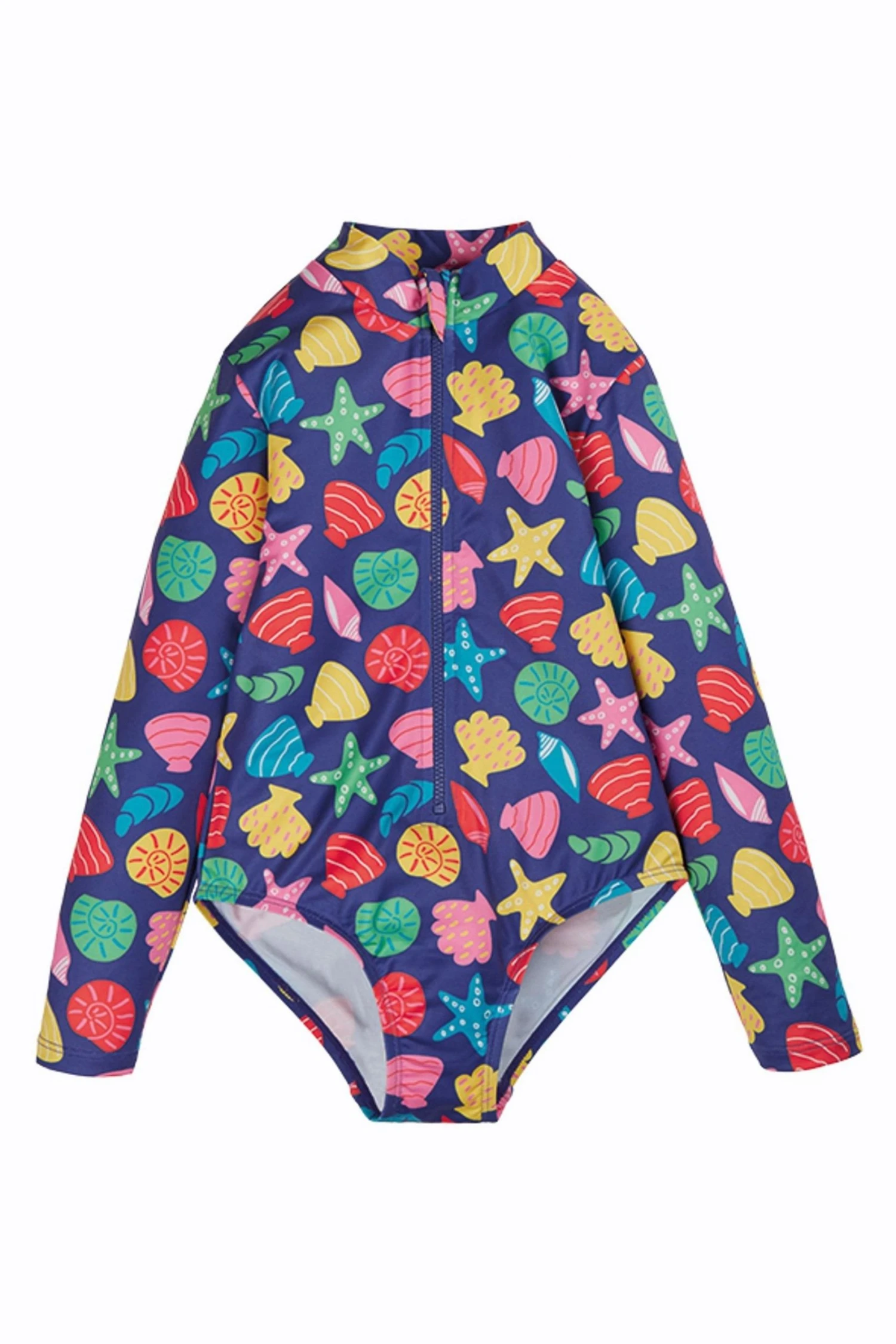 A Frugi favourite! Long sleeved swimsuit made with recycled material that meets UPF 50+ standard. Features front zip fastening for easy peasy dressing. Made with chlorine safe colours and prints.