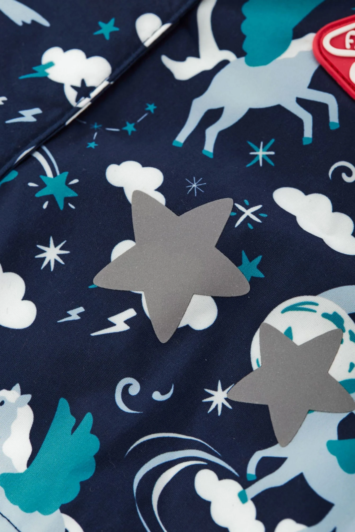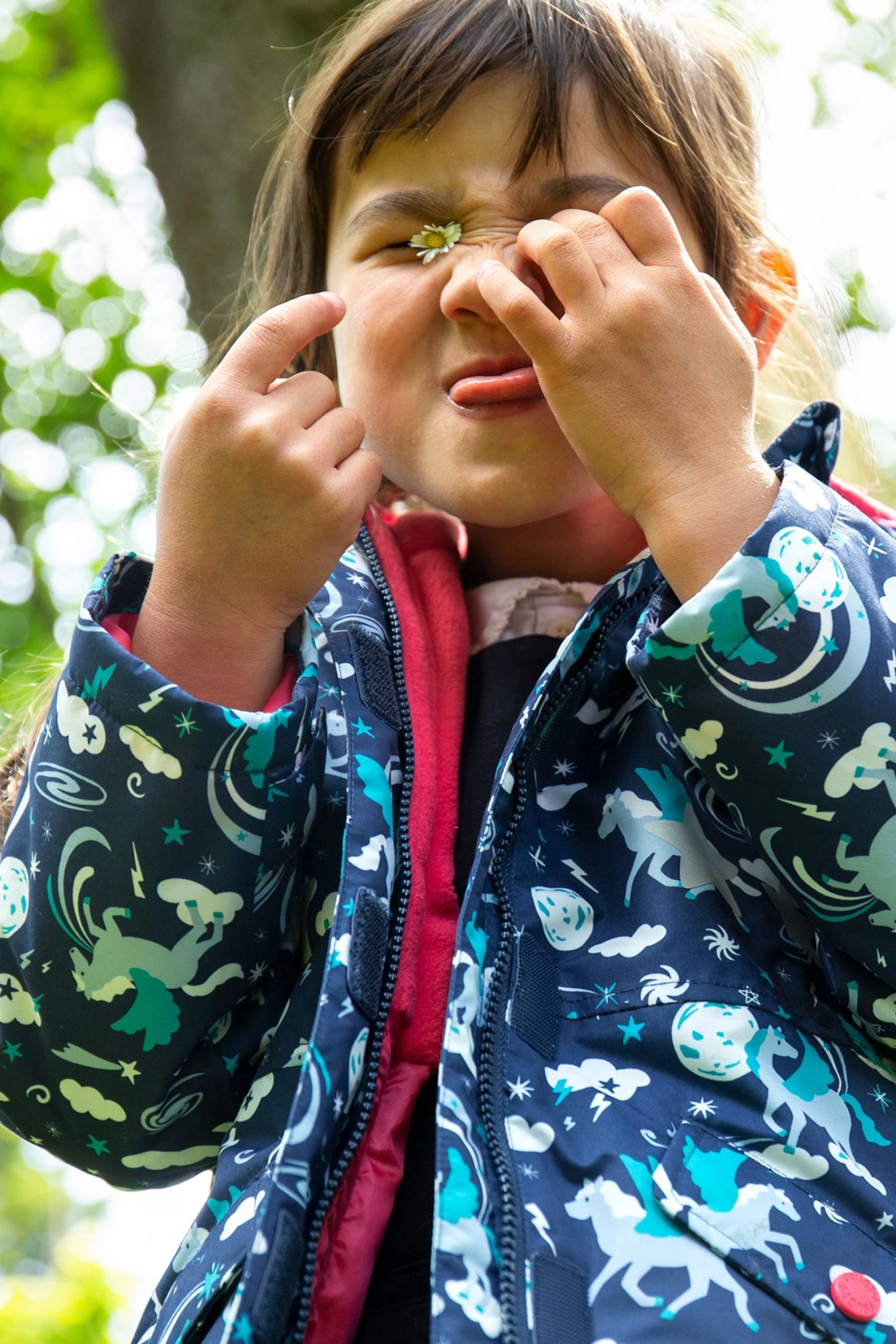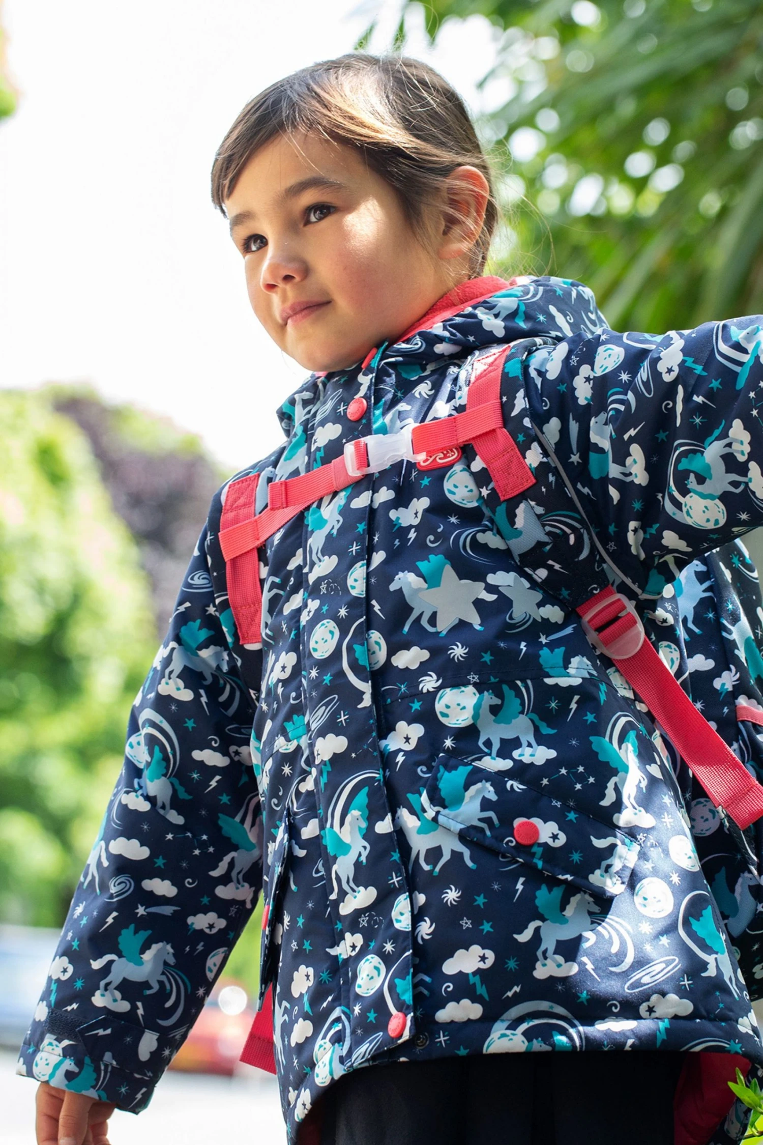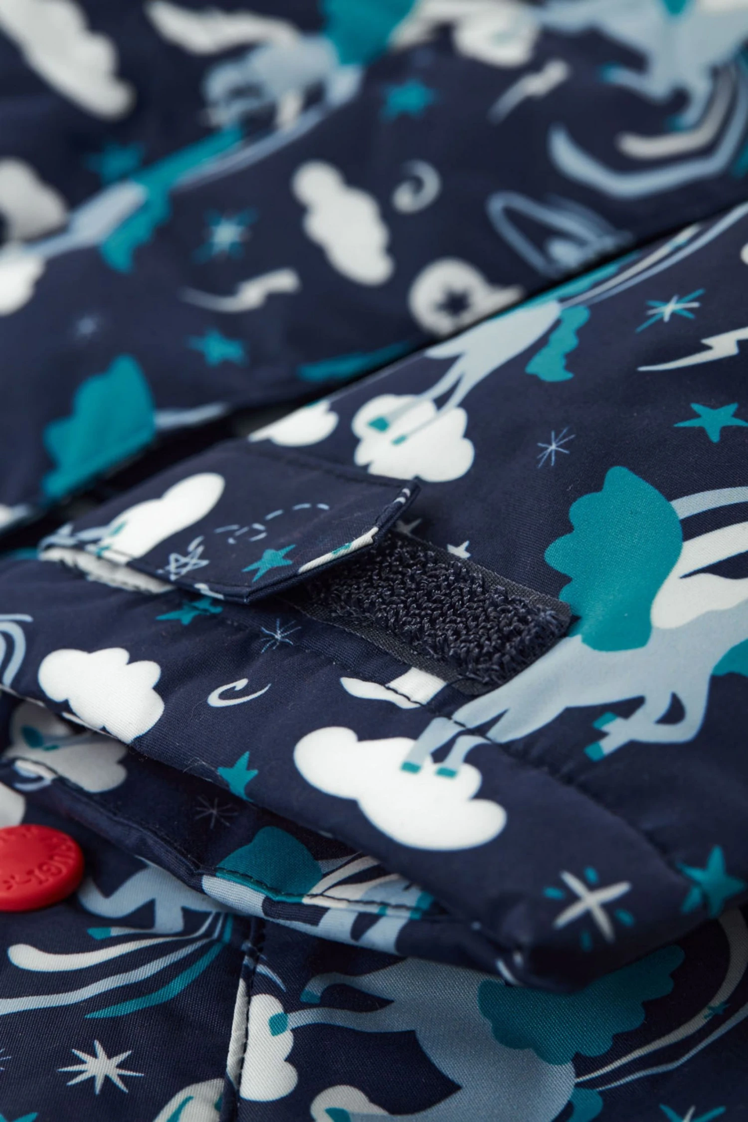 A super cosy coat with waterproof taped seams; warm wadding and soft fleece lining. Made with recycled plastic bottles, it features a durable PFC free water repellent finish, reflective detail for safety, adjustable cuffs and waist, as well as fleece lined hand warmer pockets. Zip closure with outer storm flap and chin guard.