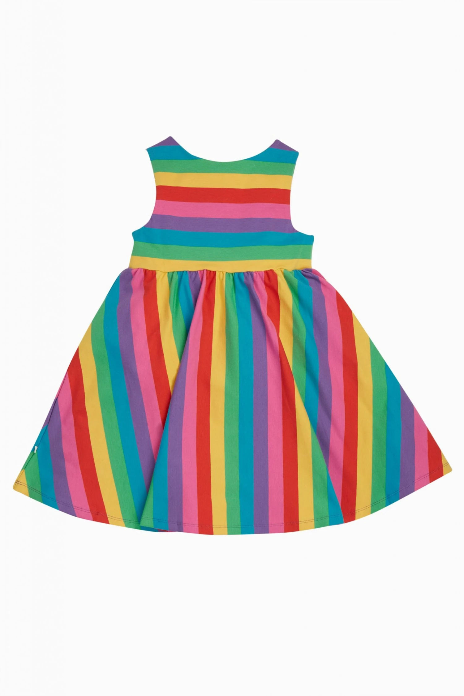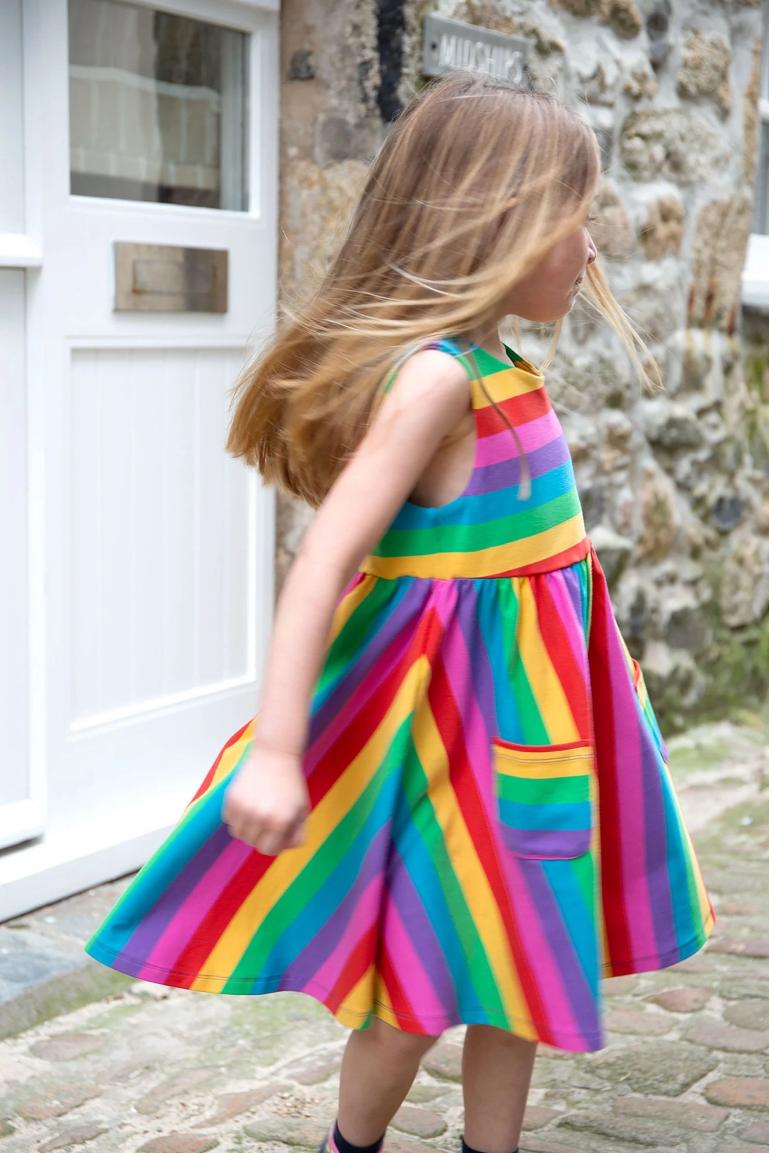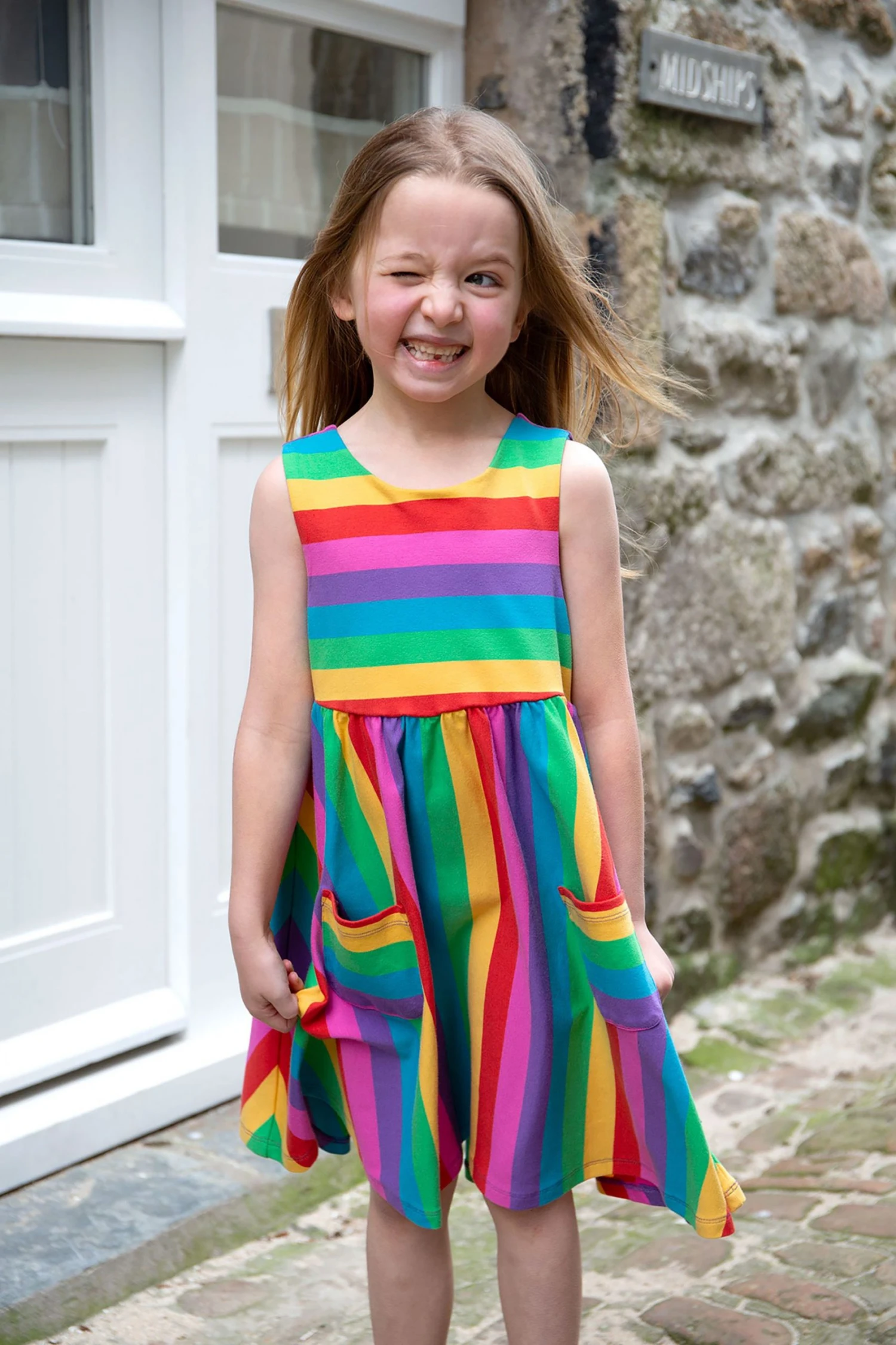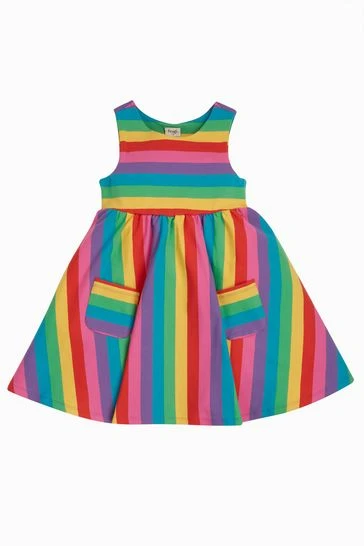 A Frugi Rainbow classic! Sleeveless stretchy organic cotton summer dress with soft gathers and patch pockets.