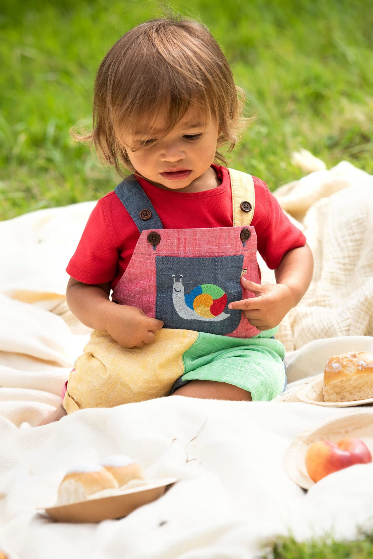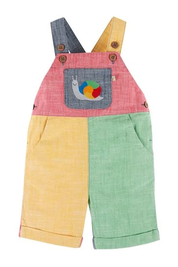 Fun colourblocked short dungarees in soft organic slub chambray, features an applique pocket and adjustable button fastening shoulder straps. Made from 100% Organic Cotton.