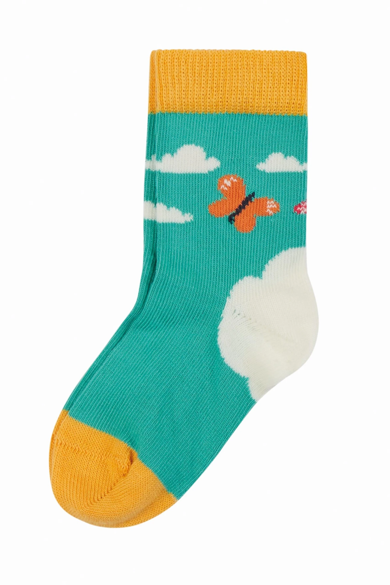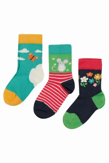 A perfect three pack of colourful socks! Featuring fun Frugi designs and a comfy rib cuff. Made from 90% Organic Cotton.
