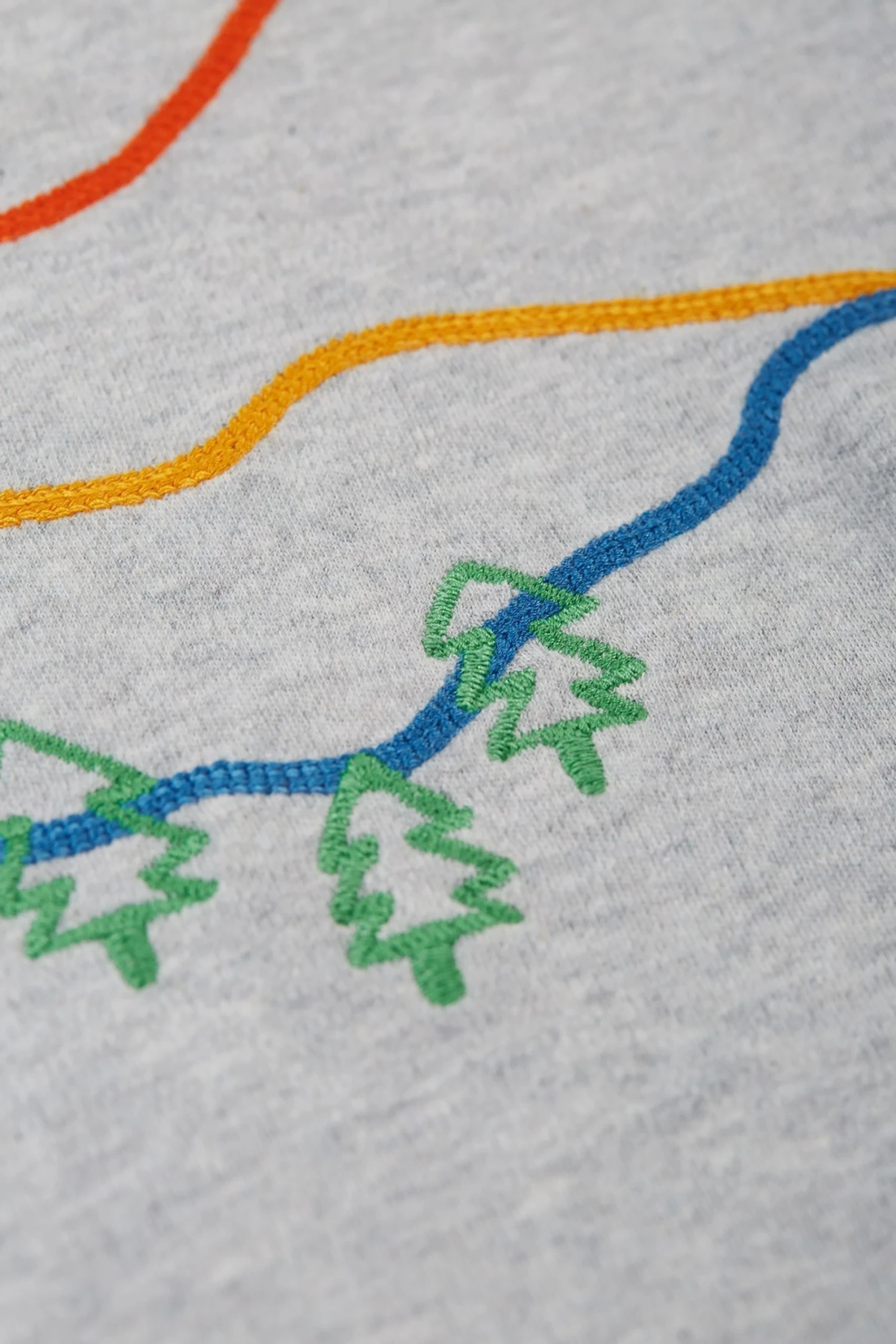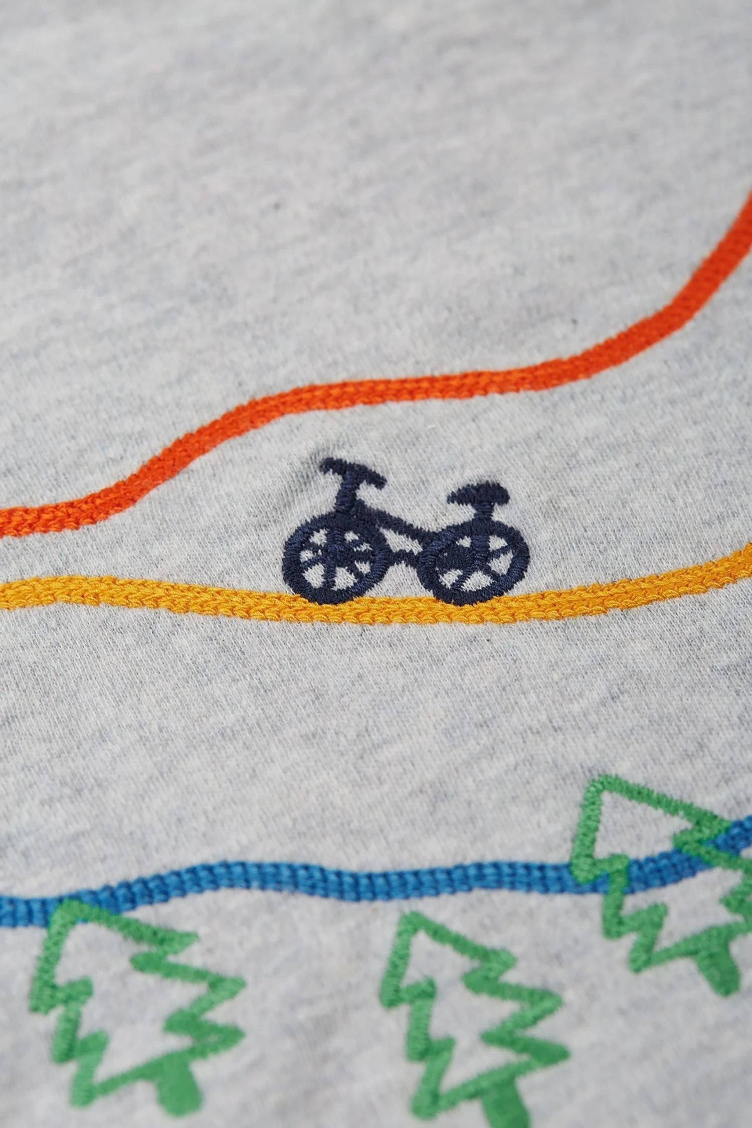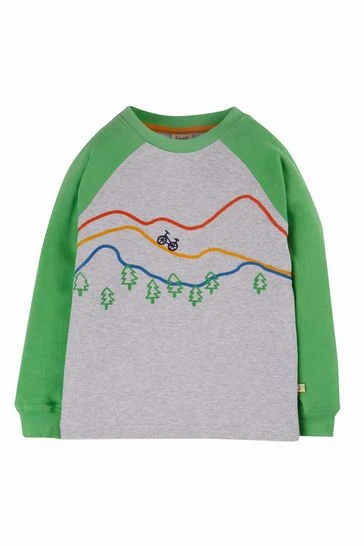 A long sleeved raglan top with mountain appliqué detail. Great to wear with so many outfits, and adds a pop of colour with the green sleeves.