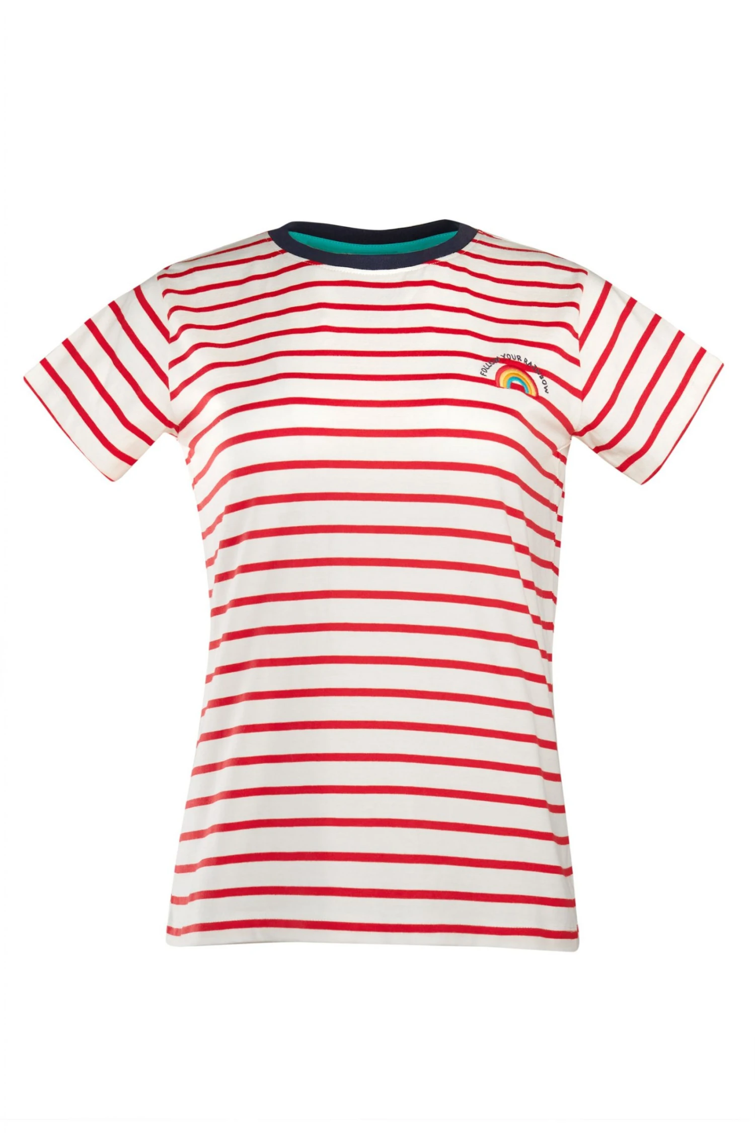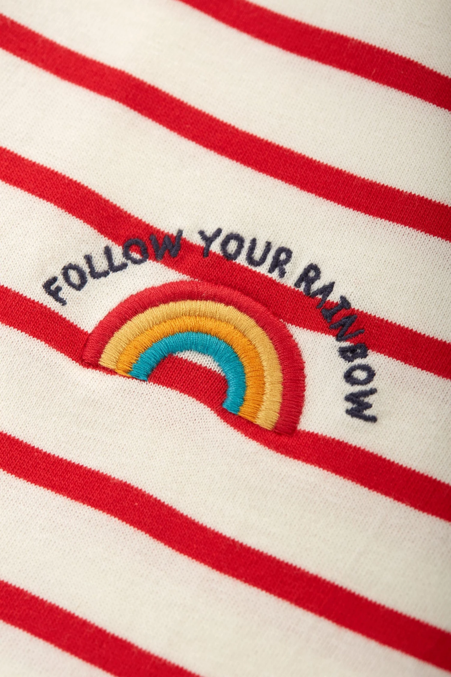 Follow your rainbow! This striped short sleeve T-shirt with applique badge detail has a matching style in the Frugi kids range…perfect for twinning opportunities!