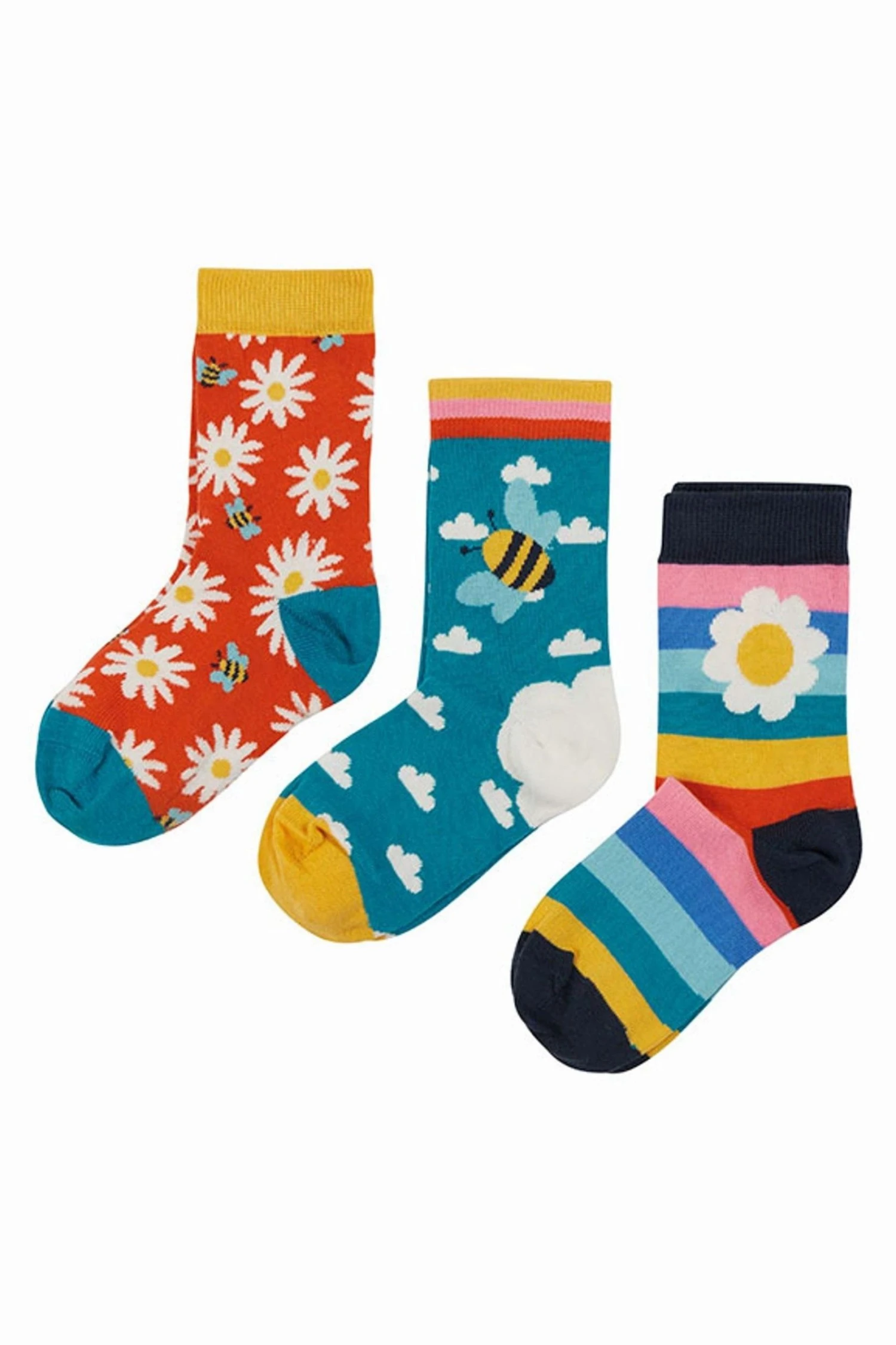 Organic cotton three pack of coordinating socks. Perfect for sensitive skin, these durable favourites will be your pick of the day! Each pair has a different character or design, all in a similar colourway.