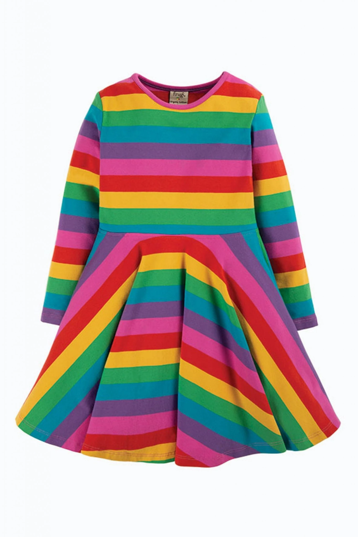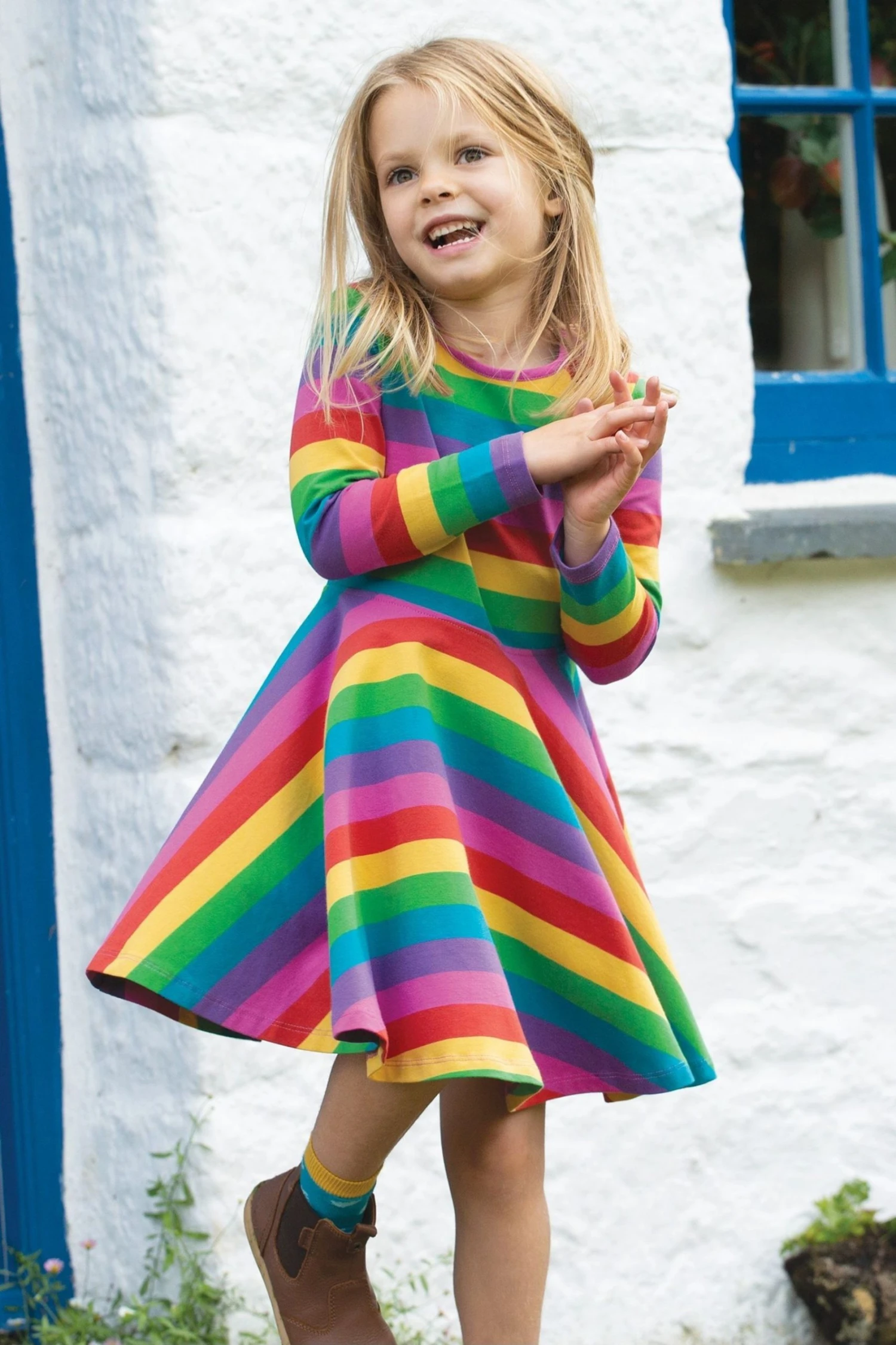 Sofia Skater Dress has had a Highlands & Islands spruce up and is now available in brand new designs for you and your little one to choose from! Perfect for little dancers, this long-sleeved dress has a full circular skirt for maximum twirling power. Foxglove Rainbow Stripe: This gorgeous design allows your little one to wear all the colours of the rainbow! Popper fastenings on the shoulder for easy peasy dressing. Great for layering over tights or leggings for a warm autumn outfit.
