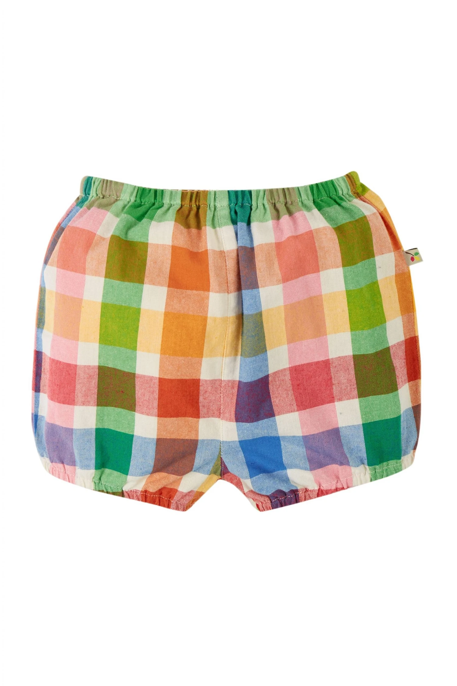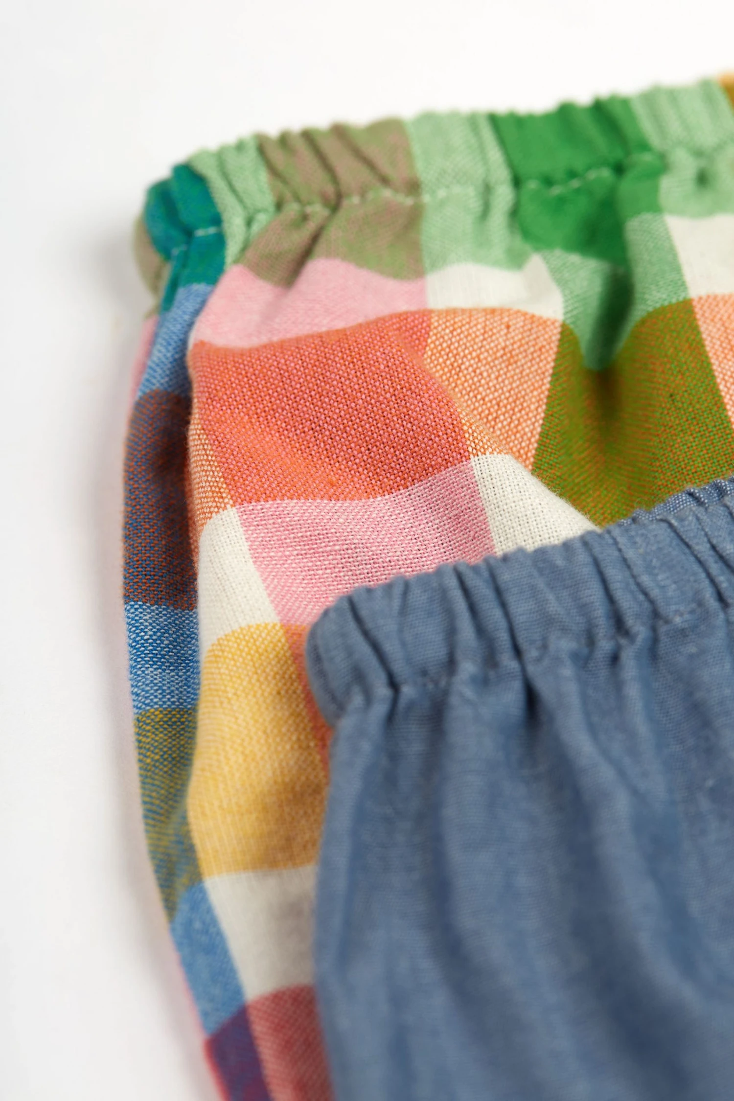 Perfect under the Frugi Sunshine Dress, this pack of two bloomers feature an elasticated waist channel and leg opening for ease of dressing and comfort. The two pack includes one chambray bloomer and one yarn dyed rainbow check bloomer.