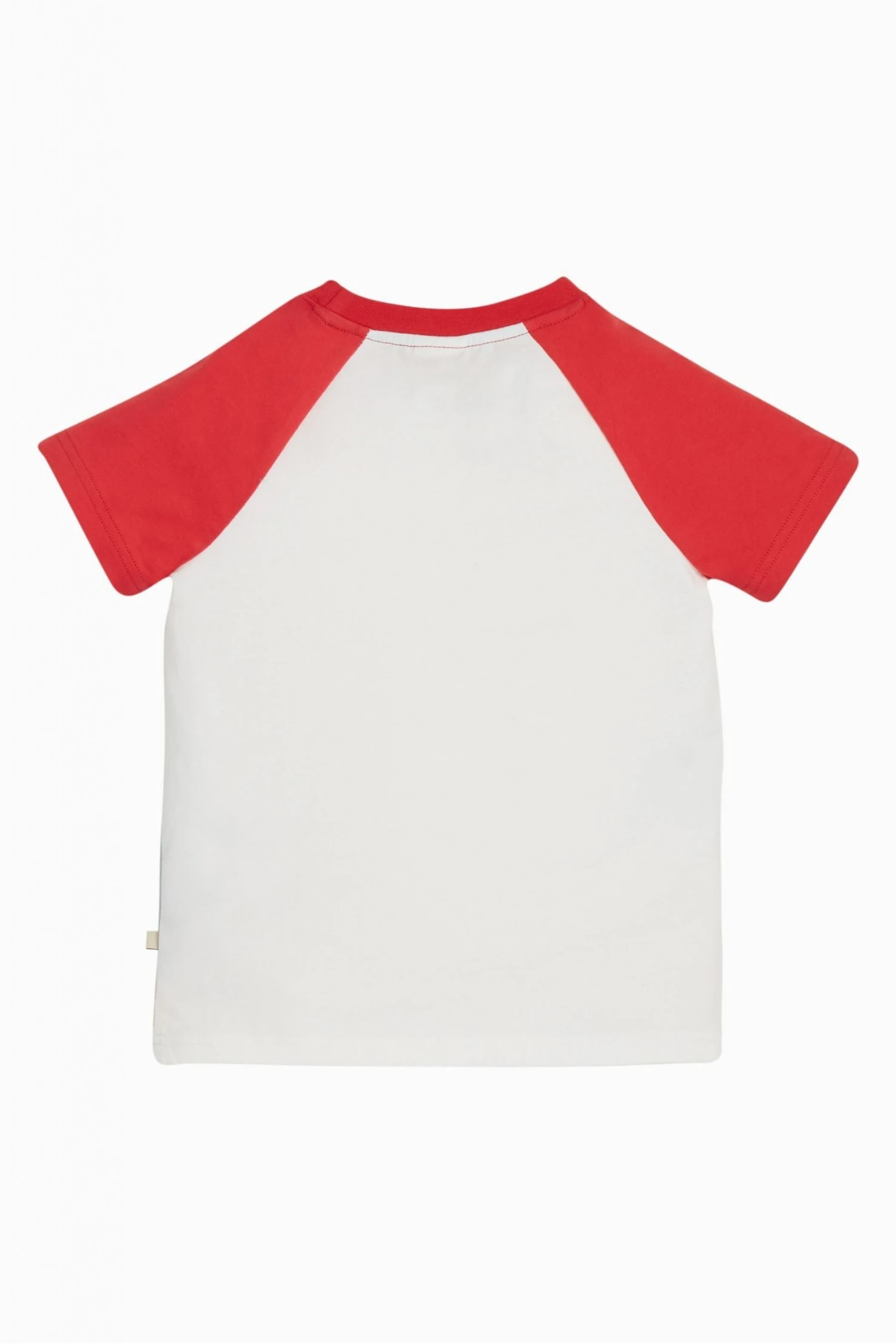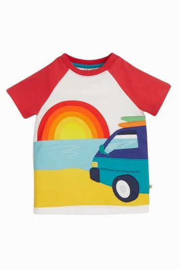 Get set for adventures with the Frugi short sleeved Raine raglan top! They love the Campervan applique and sunset print.