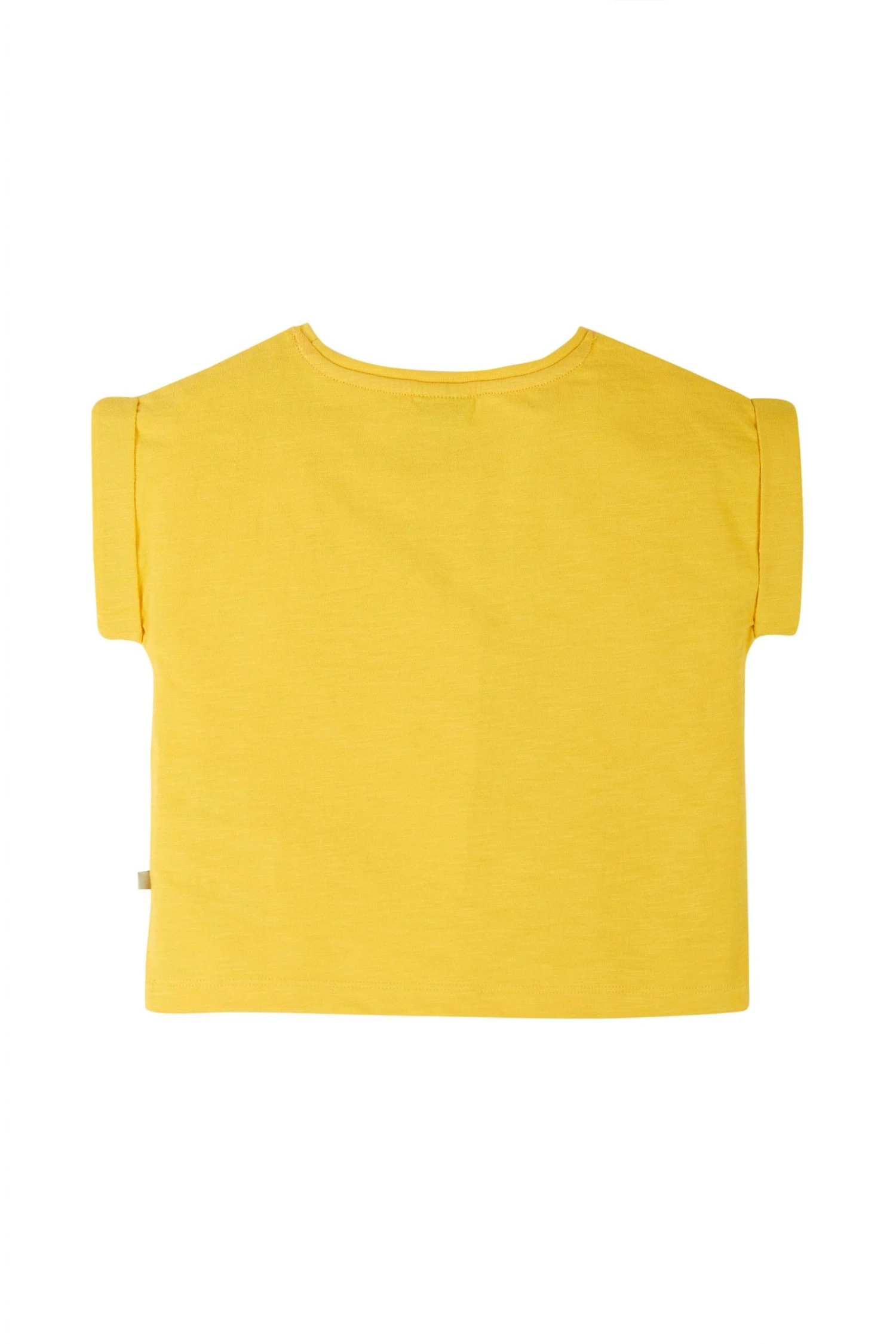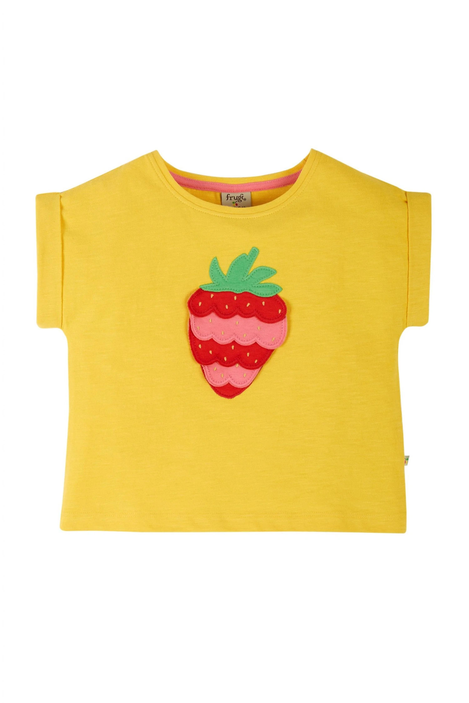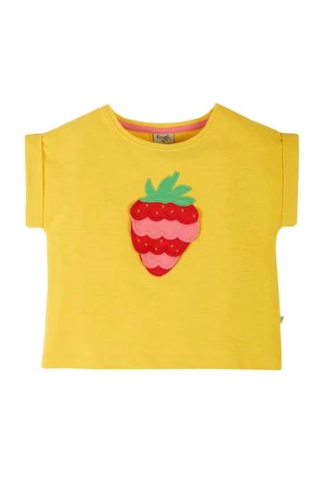 A Frugi favourite! A true summer classic, this slub jersey T-shirt is a beautiful bold yellow colour and features 3D detailing on the strawberry applique. Pair with shorts, or a skirt for a great outfit for warmer days.